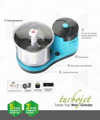 Greenchef Turbojet table top is the best choice for your kitchen and family if your cooking can be accomplished with a Wet Grinder of 2L capacity. The ABS body, multi-utility drum and coconut scrapper add delight to the experience of cooking, while a 2 year Warranty promises a relaxed mind.The Greenchef Turbojet Plus wet grinder features two separate compartments for grinding. The stainless steel grinder is made of top quality steel which will stay rust-free even with regular use. It also features a plastic wet grinder which is made of ABS food-grade plastic. The quality of the material used for both the containers will endure all the wear and tear from frequent use and last you longer than usual. So, use this versatile grinder and get ready to rule the kitchen.